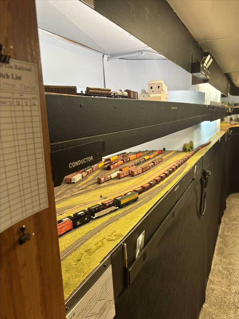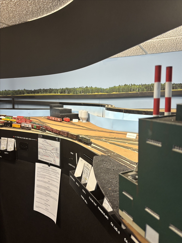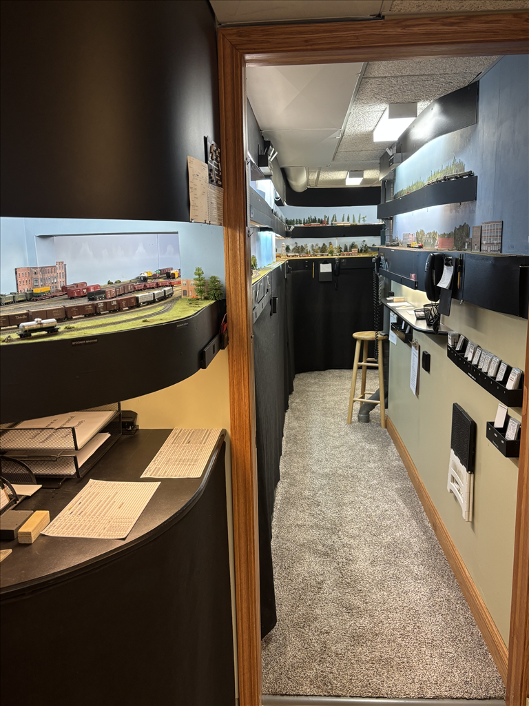 NCE DCC tethered cabs, custom designed single use waybills in plastic car card sleeves, track warrant (not time period prototypical) via a dispatcher located in a separate office controls train movement, all turnouts manually controlled, 4:1 fast clock. Communication is via telephones at each station.