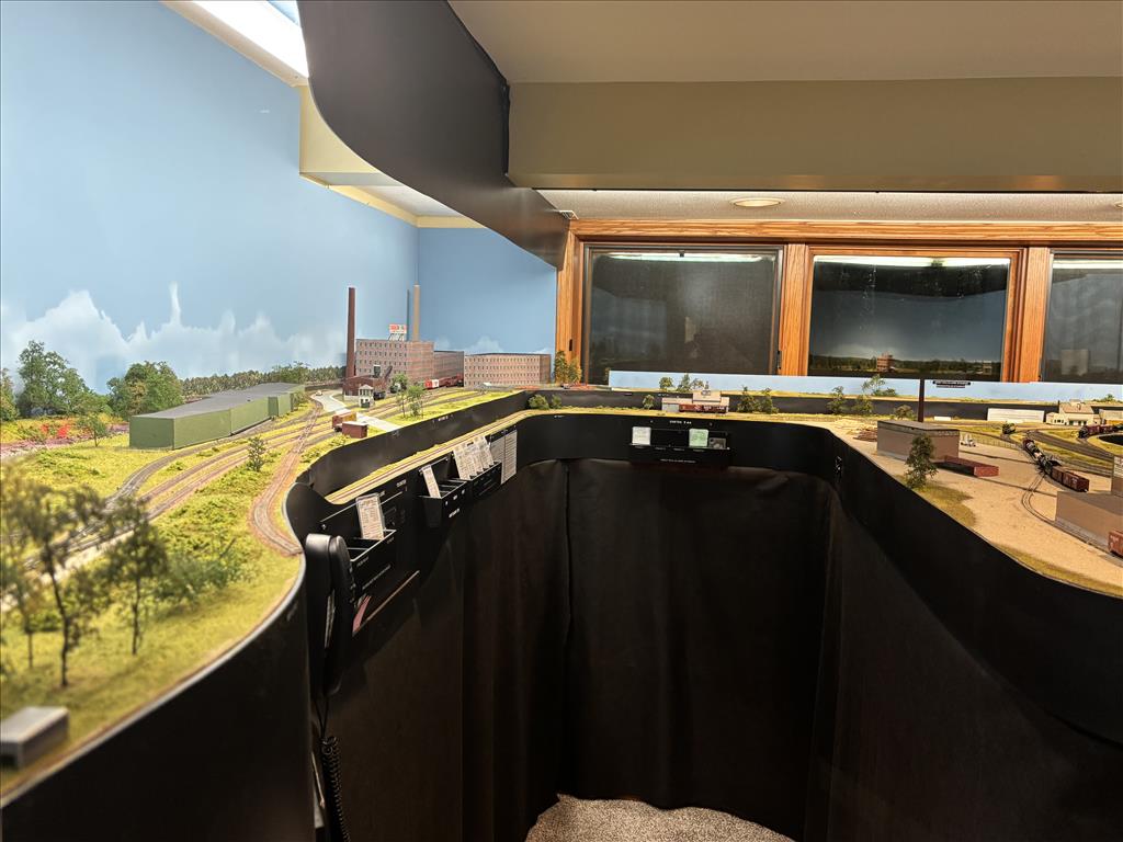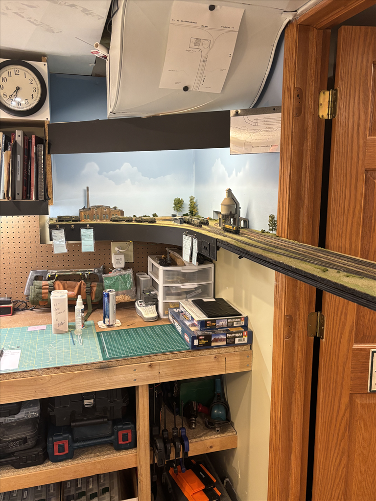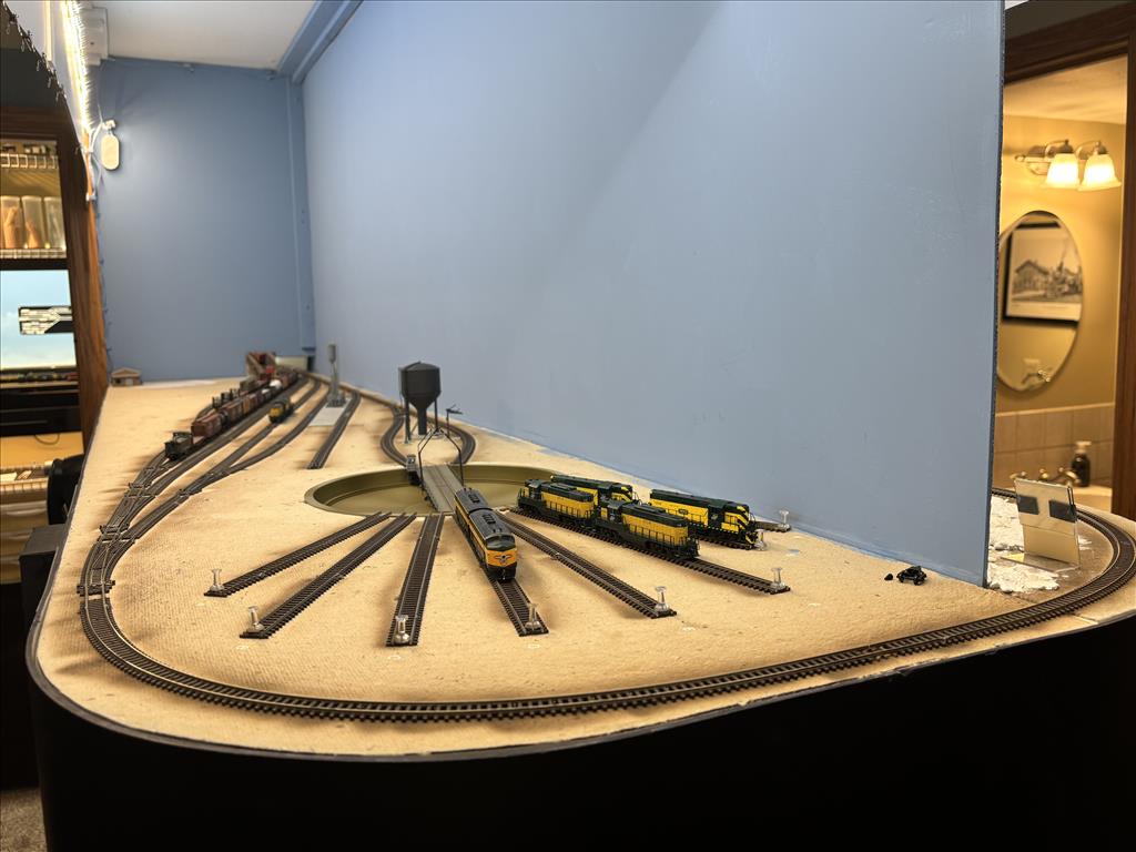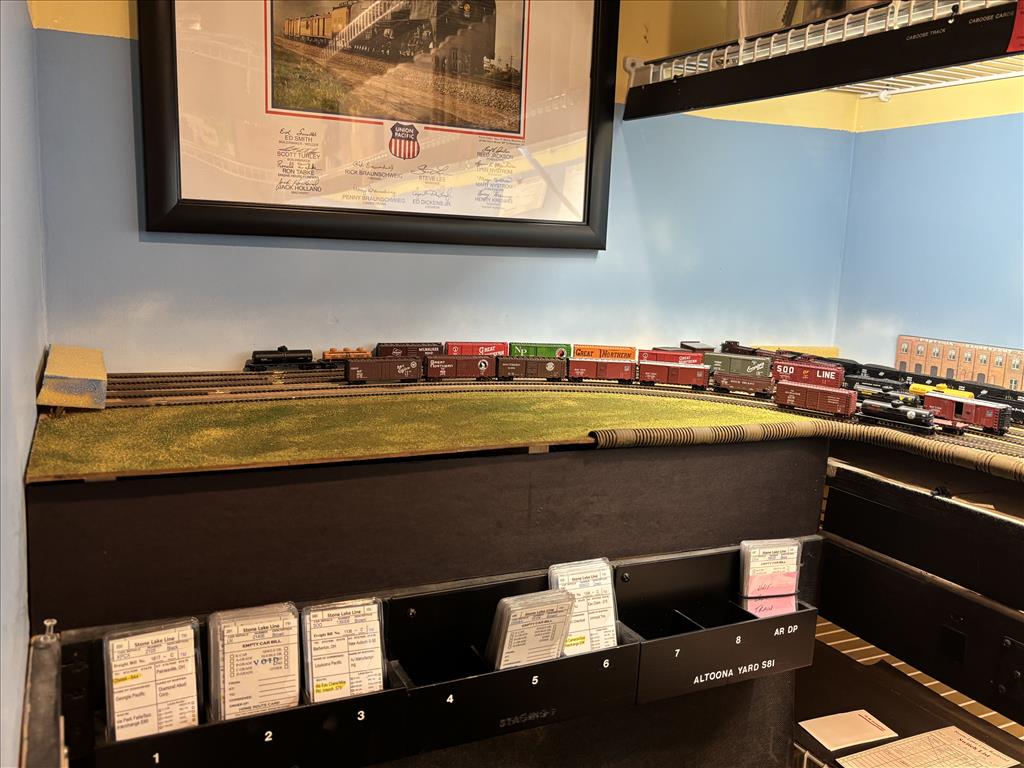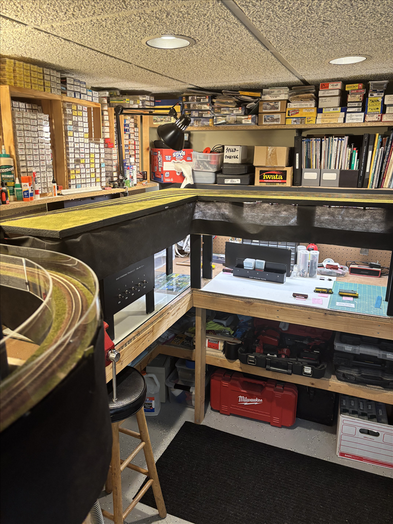 A combination of around the walls, peninsula and double deck bench work in 5 different rooms holds about 300' of main and branch line.