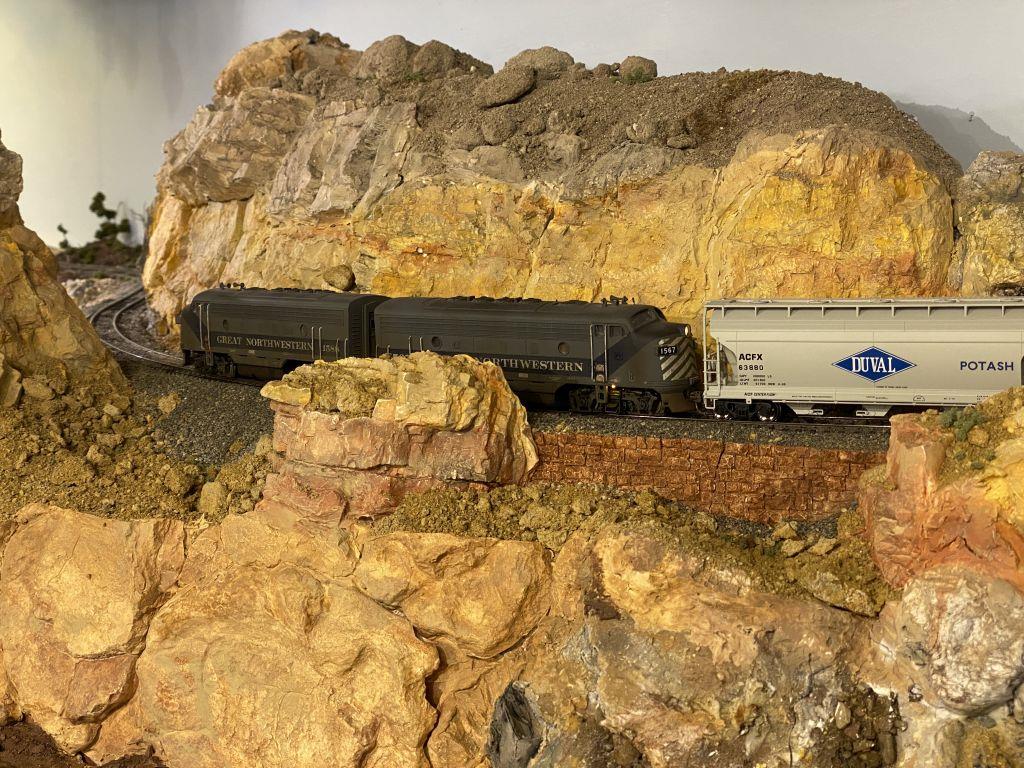 The model RR is set somewhere between Colorado and New Mexico along the main. About 100’ of main track connect hidden track to a 35’ long, 9-track staging yard, providing 27 slots for train storage. These feed the layout with the traffic to keep the rest of the operations running. The major classification yard, Armstrong (named with a head nod to the Dean of Track Planning), is placed along this main and is where cars are exchanged for on layout operation. The branch line is approximately 100’ long, and comes off the main to wind around the room, dropping into Warm Springs, a fairly industrialized town, and includes the operating areas of Sand Creek and Mesa City. Furthermore, there is another branch off the line to the mining operation of Cristo Rey, where the precious mineral Unobtainium is mined. It also is the destination of Black Water Falls (conveniently located under the kid’s bathroom toilet), which includes a daily tourist train operated by the Colorado and Southern Scenic Railroad. The operating scheme is the exchange of cars between industry and mainline trains by means of locals and manifest freights. Other on-line industries includes the Sinclair Baker Refinery, Halcon Cement and the sleepy town of Abajo Caliente which hosts a hydrocal factory. If that is not enough, there is a (very) short mining railroad line, the Ojitas RR, connecting the phosphate producing Ojitas Mine to the GNW. As for passenger operations, there is regular commute service between Armstrong and Warm Springs, as well as the aforementioned daily Amtrak train, the San Juan.