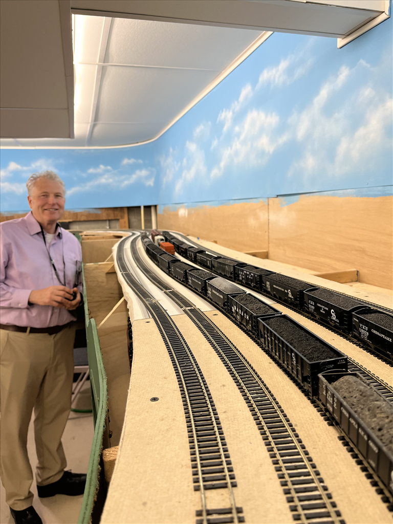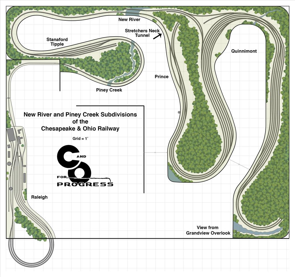 Welcome to the New River & Piney Creek Subdivisions of the Chesapeake & Ohio Railway. Although this layout only represents 3 miles of mainline trackage, it was a very busy stretch of the C&O in 1952. The visible portion of his layout goes from the east end of Stretchers Neck Tunnel at Prince, WV to the east end of the yard at Quinnimont WV and serves both the Piney Creek and Laurel Creek branch lines. Staging is provided at both the east and west ends of the mainline as well as for the Laurel Creek branch. Operating sessions feature yard operations at both Quinnimont and Raleigh (on the Piney Creek branch), coal operations along the Piney Creek Branch as well as thru and mixed freight operations.